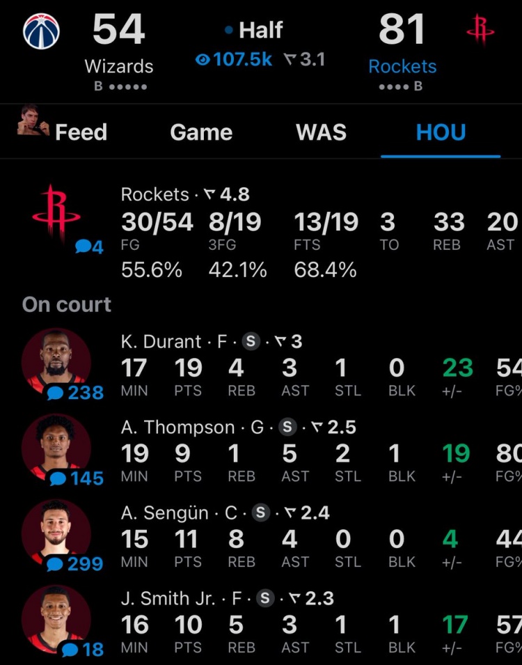 2025-11-13 16:24:40百花齐放!火箭上半场狂轰81分 并列队史上半场得分第三高!