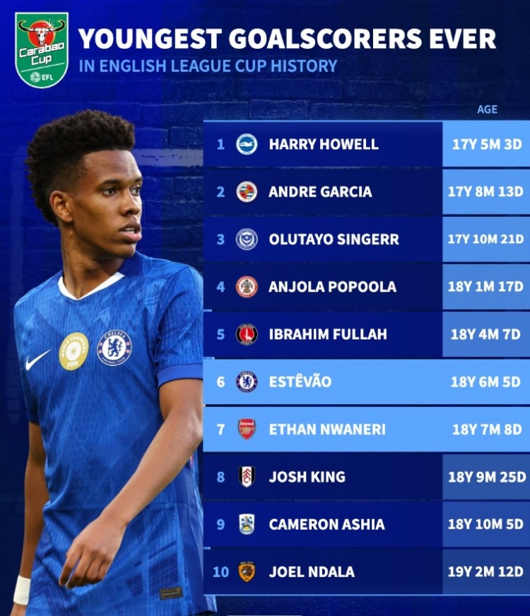18岁!埃斯特旺和恩瓦内里分列联赛杯历史最年轻进球榜第6和第7